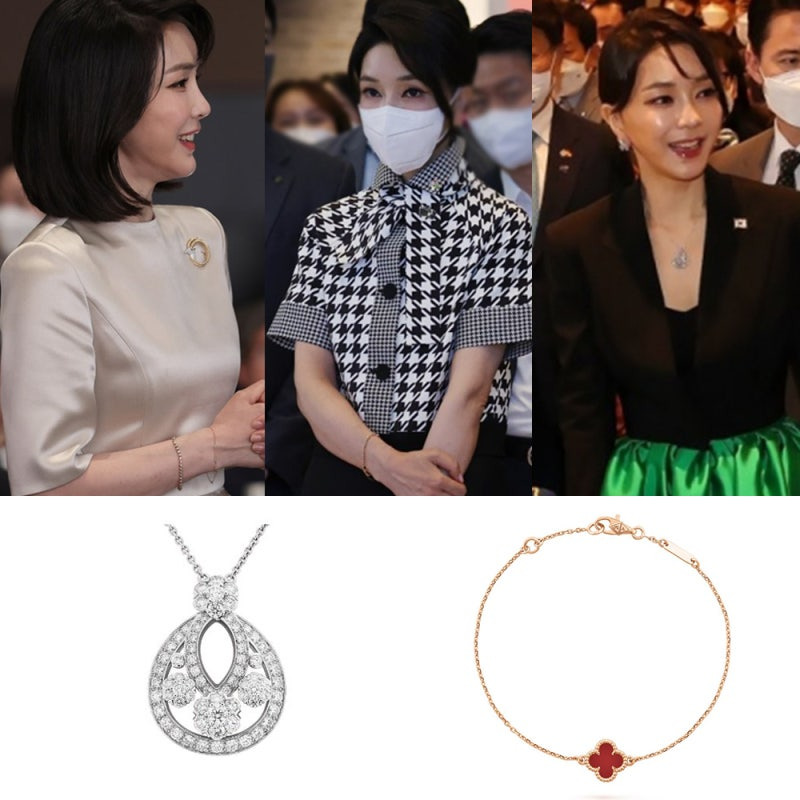 2022년 6월, 윤석열 대통령 부부의 첫 해외 순방 당시 김건희 여사가 착용한 반클리프 앤 아펠(Van Cleef & Arpels) 목걸이(6,000만원대 추정, 실제로 손에 넣기 위해서는 더 많은 비용 필요할 것으로 추정)는 많은 국민의 눈길을 끌었습니다.