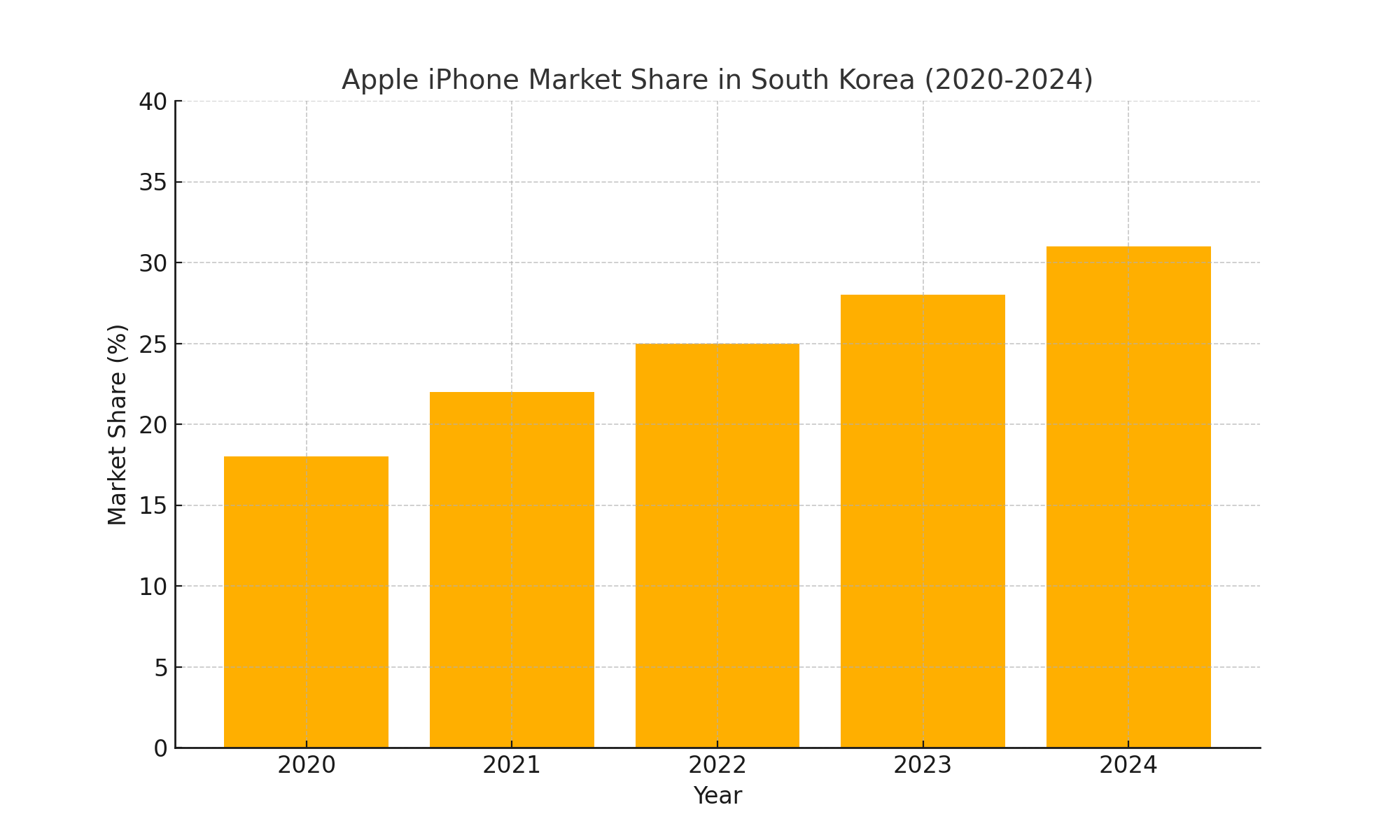 대한민국에서 2020년부터 2024년까지 아이폰의 시장 점유율은 꾸준히 증가하는 추세를 보였습니다.