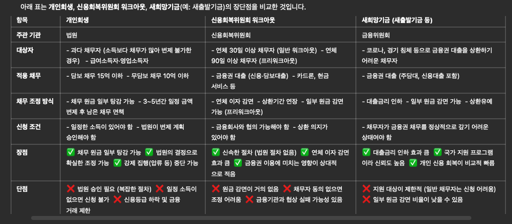 대표적인 신용회복 제도 비교
